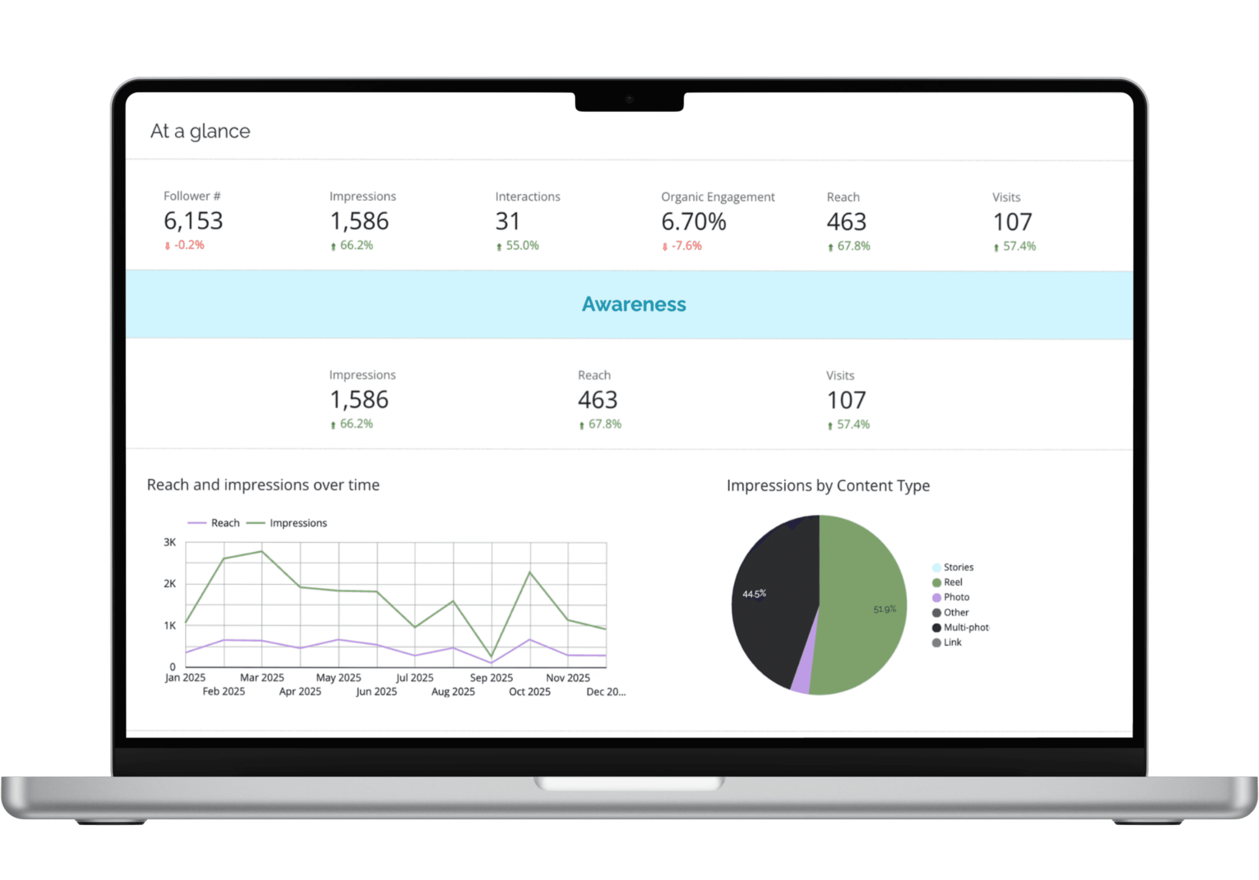 A custom dashboard puts you in control of your social media data. Check your numbers whenever you want, alongside the quarterly report. The data updates in real time, you access it on your schedule, and you see everything in one place instead of jumping between platforms. Your metrics are yours to monitor however closely or casually you want.